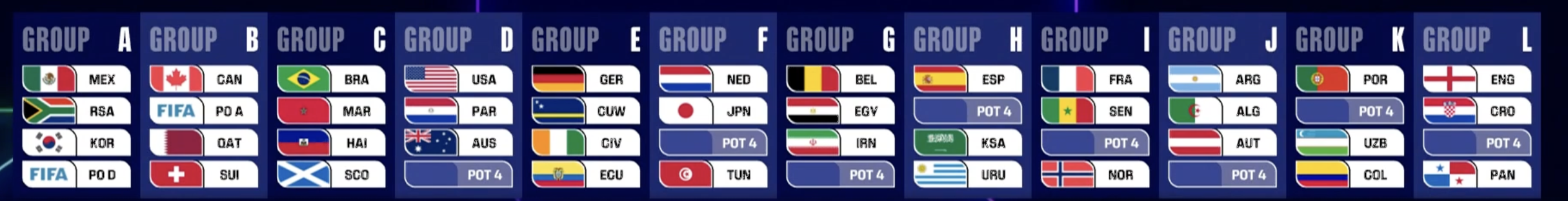 | Pot 4 | 유럽 PO D 승자 (미정) | 덴마크, 북마케도니아, 체코, 아일랜드 중 결정 |